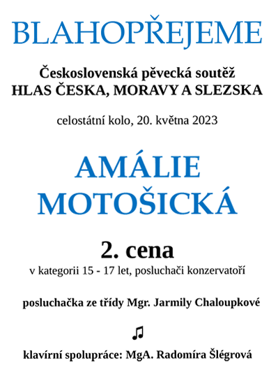 V celostátním kole Československé pěvecké soutěže Hlas Česka, Moravy a Slezska získala studentka klasického zpěvu Amálie Motošická 2. cenu v kategorii posluchačů konzervatoří 15–17 let. Blahopřejeme Amálii, její profesorce Mgr. Jarmile Chaloupkové a děkujeme za klavírní spolupráci MgA. Radomíře Šlégrové.