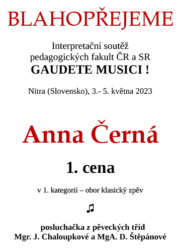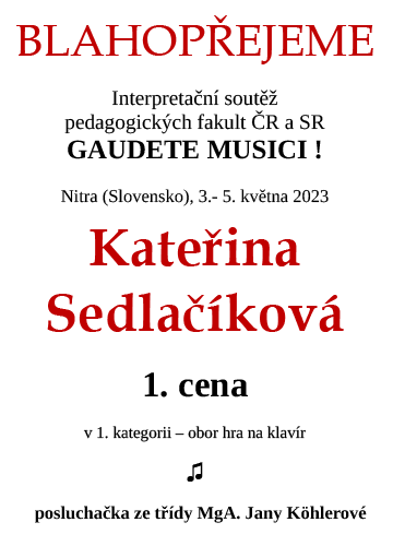 Blahopřejeme oběma studentkám ke skvělému úspěchu a také jejich pedagožkám MgA. Janě Köhlerové (klavír), Mgr. Jarmile Chaloupkové a MgA. Daniele Štěpánové (klasický zpěv).