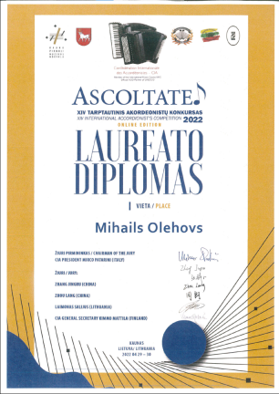 Student Mihails Olehovs, z akordeonové třídy Mgr. Romana Malého, dosáhl dalšího vynikajícího úspěchu, a to prvního místa na prestižní Mezinárodní akordeonové soutěži v Litvě.