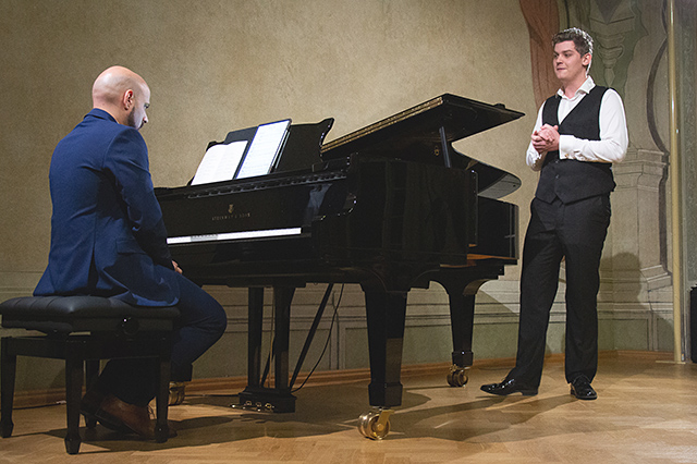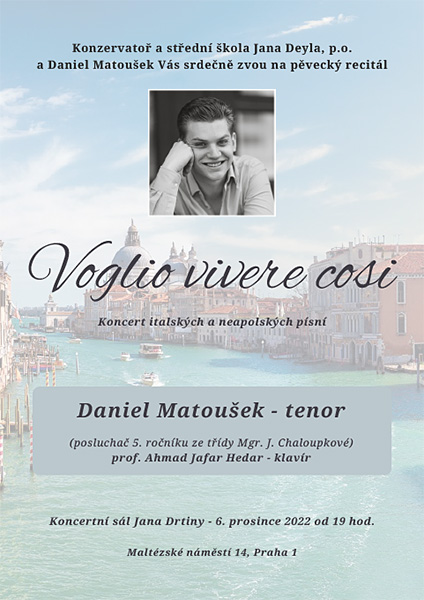 V úterý 6. prosince proběhl v koncertním sále školy již avizovaný pěvecký recitál studenta 5. ročníku Daniela Matouška ze třídy Mgr. Jarmily Chaloupkové. Na klavír doprovázel mladého tenoristu, který je již nyní sólistou opery Národního divadla v Praze, prof. Ahmad Hedar.