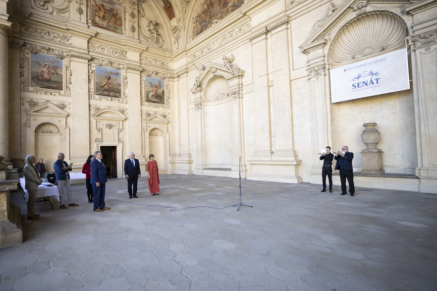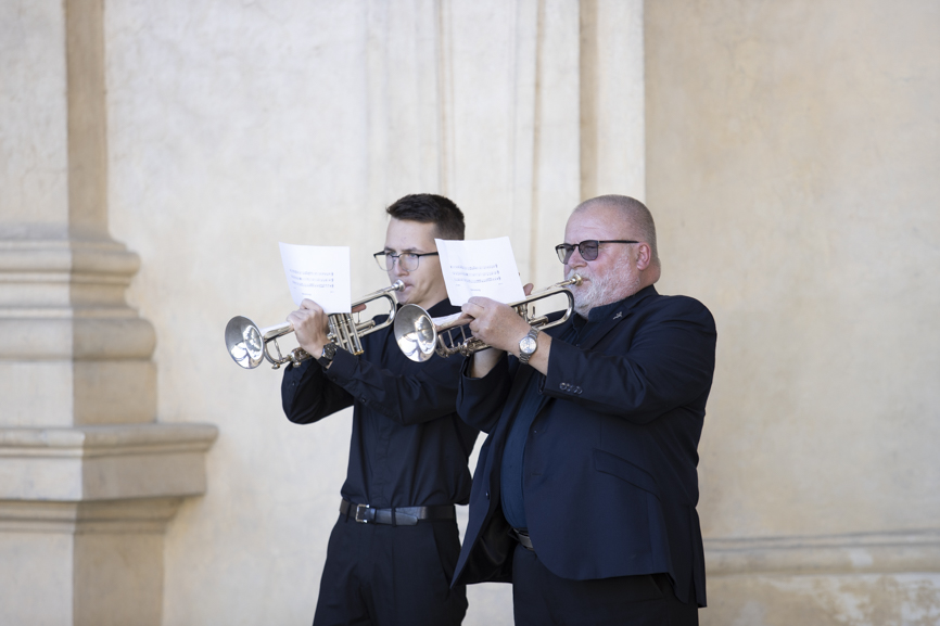Vernisáž výstavy "Má vlast cestami proměn" zahájil trumpetista Dmitri Chuyashov, posluchač 2. ročníku Konzervatoře a střední školy Jana Deyla. Společně se svým profesorem, Mgr. Josefem Zámečníkem, zahráli pro přítomné hosty pod arkádami Valdštejnské zahrady v pondělí 26. září.